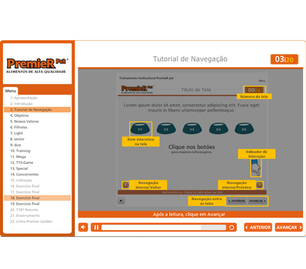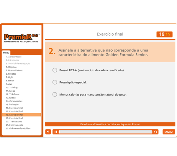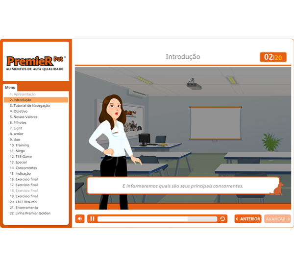 Jobs I have done All Projects e-learning Premier Pet - Golden » Previous Next » The Challenge In this work I had to merge Articulate with Adobe Flash and thus have animated characters and with locution and caption all in sync and running on mobile devices. Jobs I did Animation Audio Edition Information Architecture User Interface Design